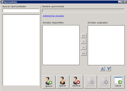 Al acceder por primera vez a la ventana de oportunidades encontraremos vacías las listas de oportunidades y estados.
